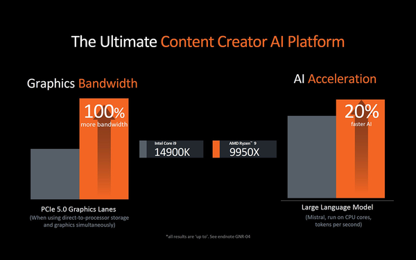 AMD cũng nhấn mạnh đến hiệu xuất AI của Ryzen™ 9000 Series nhờ các lane PCIe 5.0 chuyên dụng và tăng tốc AI lên đến 20% trong các mô hình ngôn ngữ lớn như Mistral. Điều này mở ra nhiều tiềm năng ứng dụng trong lĩnh vực trí tuệ nhân tạo.
